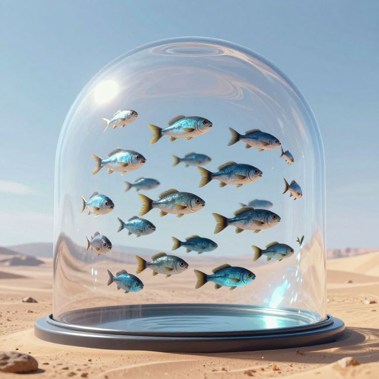 A surreal 3D-rendered scene depicts a school of fish gracefully swimming inside a transparent, crystalline dome suspended above a barren desert landscape, defying gravity and natural elements in a mesmerizing display of fluid motion and light reflections.