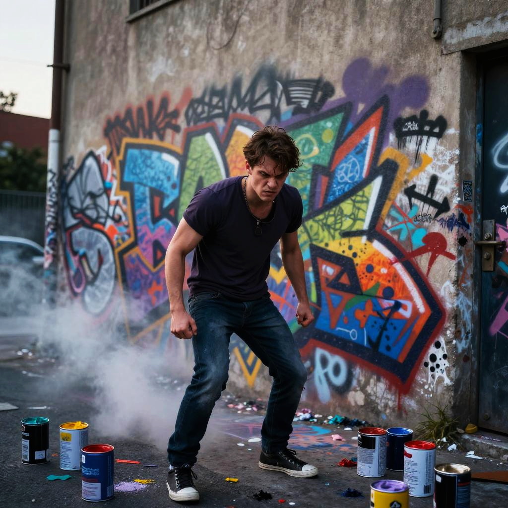 Angrier street artist spraying graffiti on an urban wall at twilight, bold colors splashing dynamically, focused intense gaze, scattered paint cans and misty atmosphere, gritty yet vibrant city vibe, capturing raw emotion and creative rebellion.
