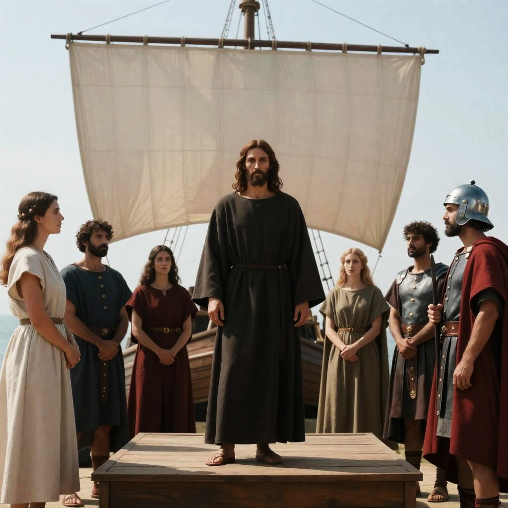 Photograph of a medieval kitchen scene with six men in white and beige robes and hats. One man in a green and black striped robe stands on the right, facing a bearded man in a white robe. The kitchen is dimly lit with hanging pots, copper pans, and a clay jug on a wooden table. Light streams in from the left.