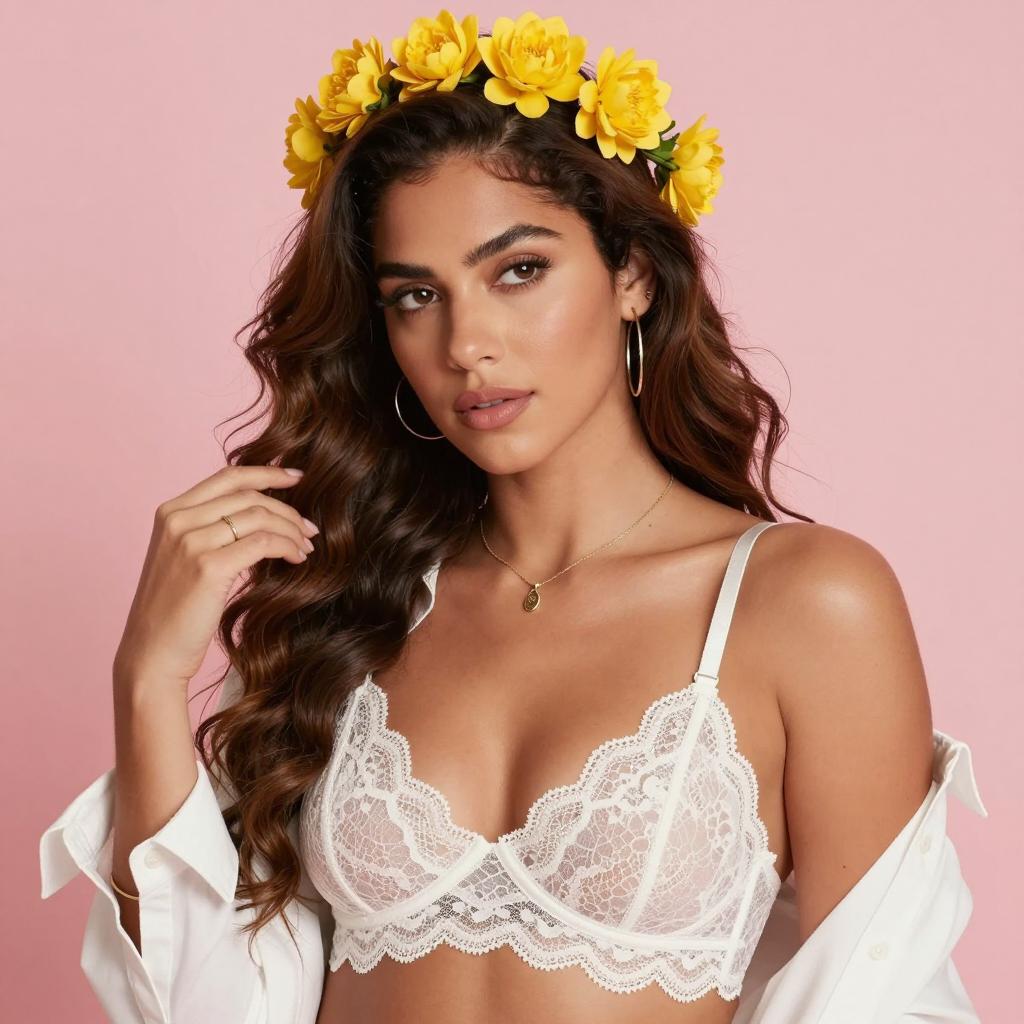 Portrait of a woman with medium skin tone and dark wavy hair wearing a yellow lace bra and an open yellow robe. She has an intense gaze and is standing indoors near a window with green foliage visible outside. The woman holds the edges of her robe and faces the camera directly.