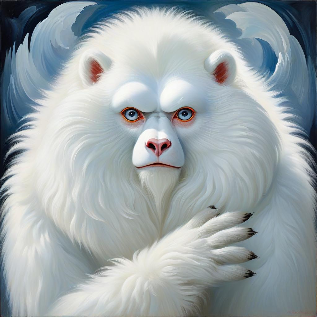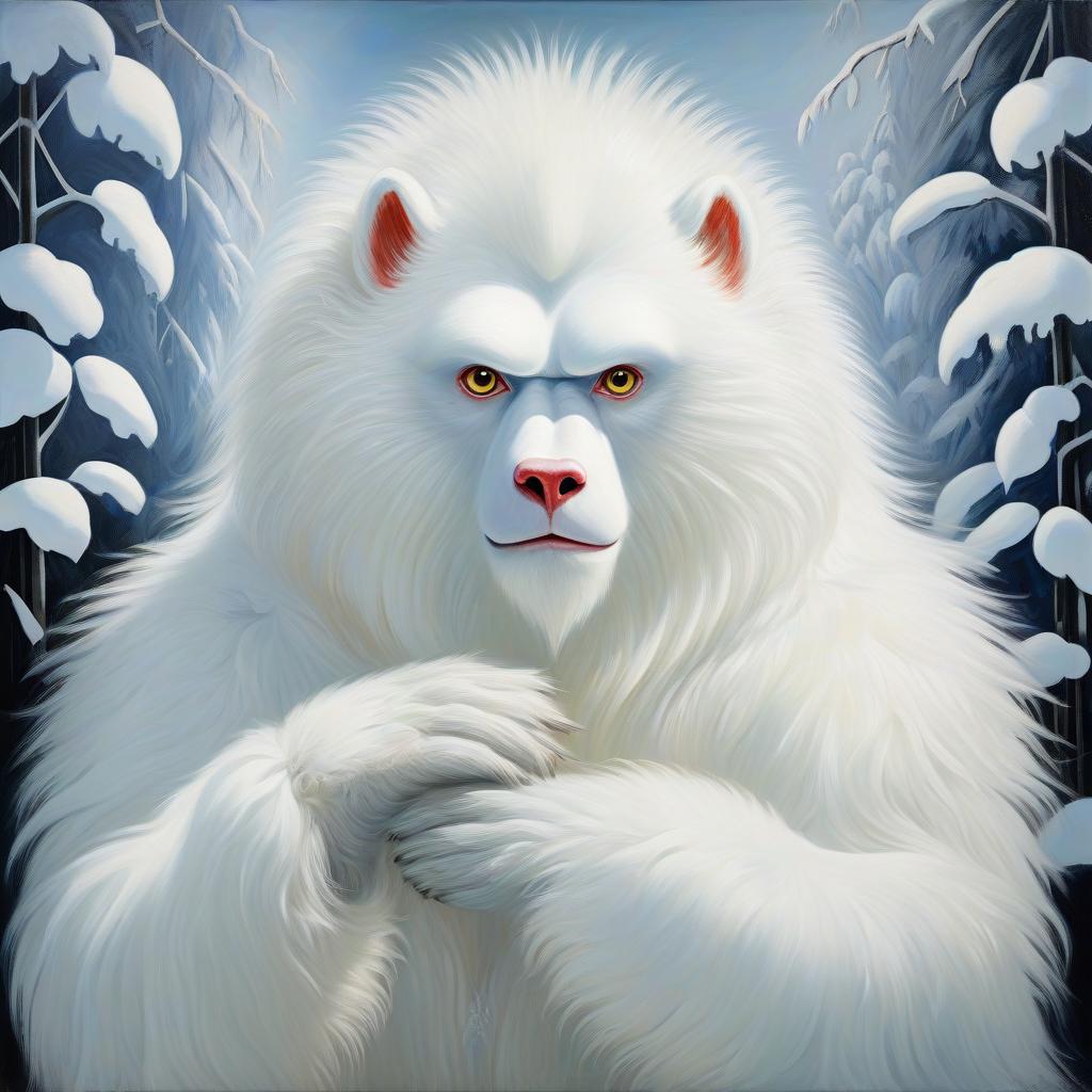 Yeti, glamorous and beastly with thick white fur, deep-set eyes, and large hands, arctic furry portrait, oil on canvas by Hilma af Klint and Tamara de Lempicka, mystical garden, wonderland of beauty and enchantment