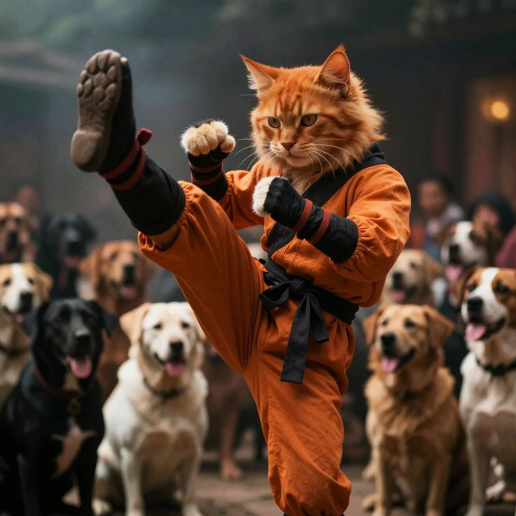Orange/black fluffy cat ninja, drunken fist, fight stance, high kick, split, infront of Dog crowd, very detailed, atmospheric haze, Film grain, cinematic film still, shallow depth of field, highly detailed, high budget, cinemascope, moody, epic, OverallDetail, gorgeous, 2000s vintage RAW photo, photorealistic, candid camera, color graded cinematic, eye catchlights, atmospheric lighting, skin pores, imperfections, natural, shallow dofintricate, elegant, fantasy art, portrait, dark, retro, ecstatic, plain, powerful, realistic, profoundly red dark color