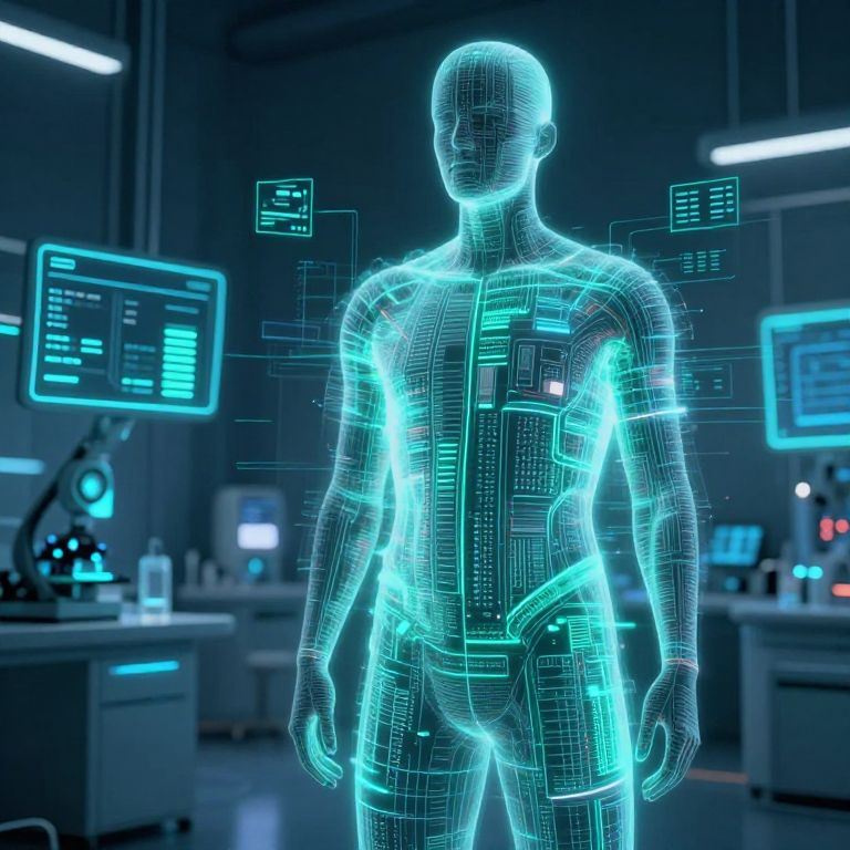 CGI image of a glowing, wireframe human figure in a futuristic lab, surrounded by blue neon computer screens and data interfaces.