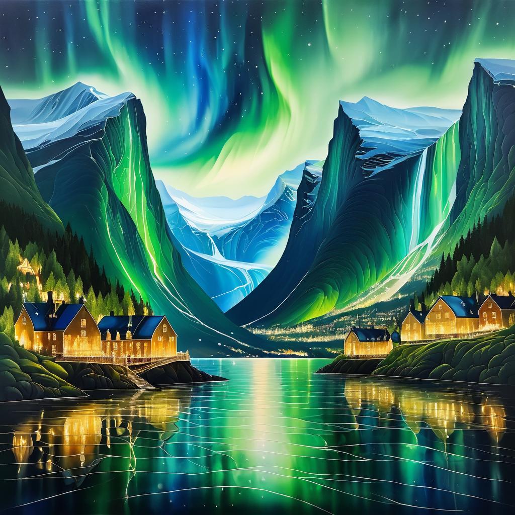 Fine detail painting of the fjords of Norway under the northern lights in the style of Turner, with ornate and intricate elements.