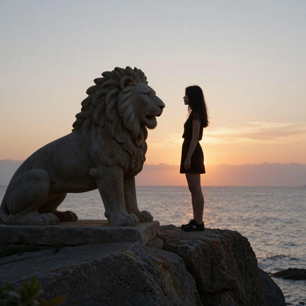 Photograph of a silhouetted young girl with long hair standing on a rocky cliff, facing a large, detailed stone lion statue. The sunset in the background casts a warm, orange glow over the calm ocean. The lion is positioned on the left, sitting majestically on a larger rock, while the girl stands to the right, slightly turned towards the lion. The sky transitions from orange near the horizon to pale blue higher up. The rocks are textured and dark, contrasting with the soft, colorful sky. The scene evokes a sense of calm and contemplation.