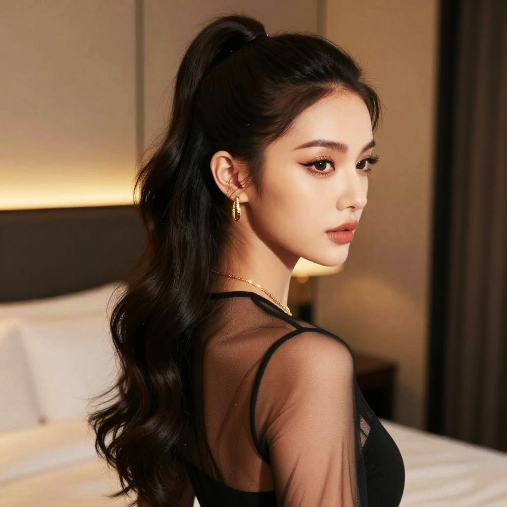 Bedhead Look hairstyle on female dancer, wearing form-fitting leotard, in dance studio, captured in fashion editorial style with warm sodium lamp glow.