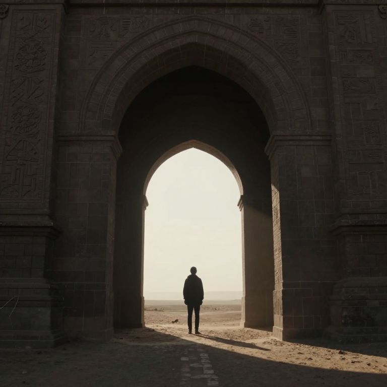 Through the colossal archway, a solitary figure stands at the threshold of an unknown realm, where the interplay of light and shadow whispers of freedom and mystery, while the faint echo of footsteps and the scent of earth evoke a profound sense of anticipation and existential wonder.
