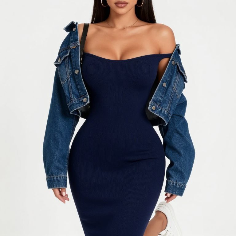 "Bodycon dress, midi length, ribbed knit, deep navy blue, off-shoulder design, body-hugging, paired with cropped denim jacket, dark indigo, classic fit, button-up front, subtle fading, accessorized with white sneakers, canvas, simple hoop earrings, crossbody bag.. Sexy. Pretty face and beаutiful eyes. Big breasts."
