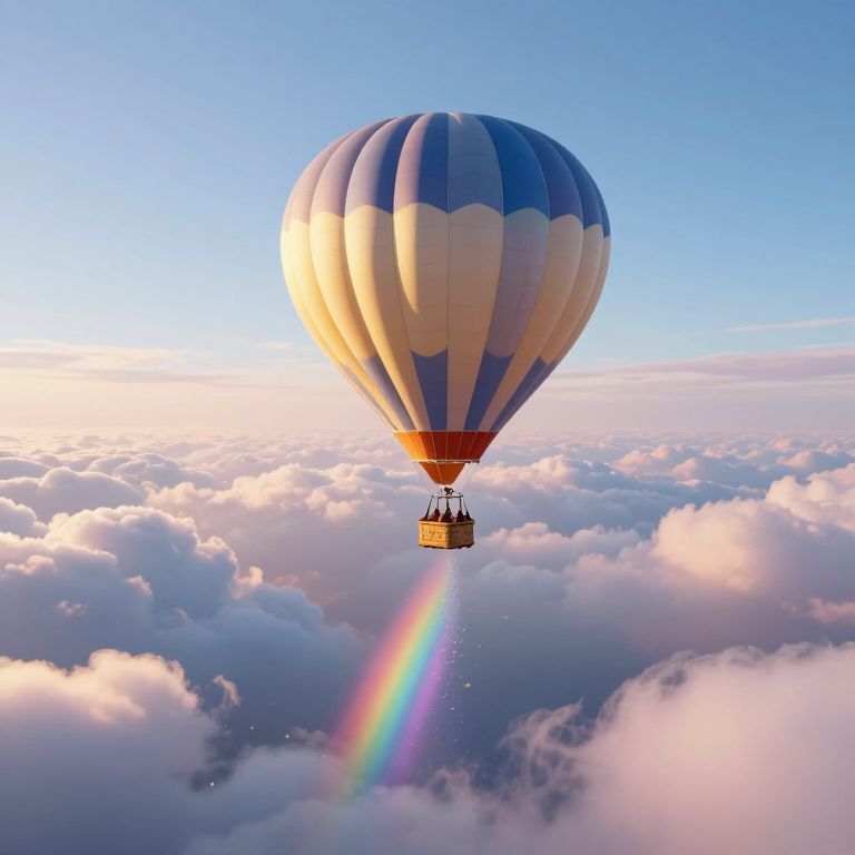 Imagine a mesmerizing panoramic digital artwork, reminiscent of Surrealism's dreamlike essence. The scene showcases an expansive, cloud-filled sky in soft pastel shades, viewed from an innovative aerial perspective that captures the boundless expanse above. Suspended within this ethereal realm is a solitary hot air balloon, its lavishly adorned basket gleaming under the warm golden sunlight as it drifts serenely through the void. The delicate interplay of light and shadow across the meticulously crafted gondola creates an atmosphere of both enchantment and intrigue, inviting viewers to immerse themselves in a whimsical world where reality blends seamlessly with fantasy. As the hot air balloon ascends into this surreal landscape, its shimmering trail of iridescent particles casts rainbows that dance gracefully through the serene scene, creating a gradient of emotion that evokes a sense of wonder and awe as they ripple harmoniously across the vast azure expanse above.