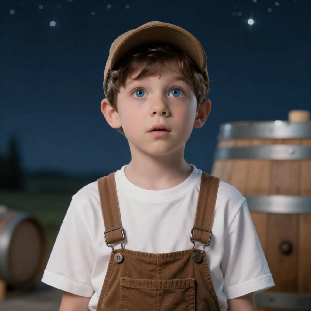 CGI boy with large blue eyes, brown cap, white shirt, brown overalls, looking up. Wooden barrel with metal band in background. Starry night sky. Boy's face shows mild surprise. Barrel on right side. Boy centered in frame.