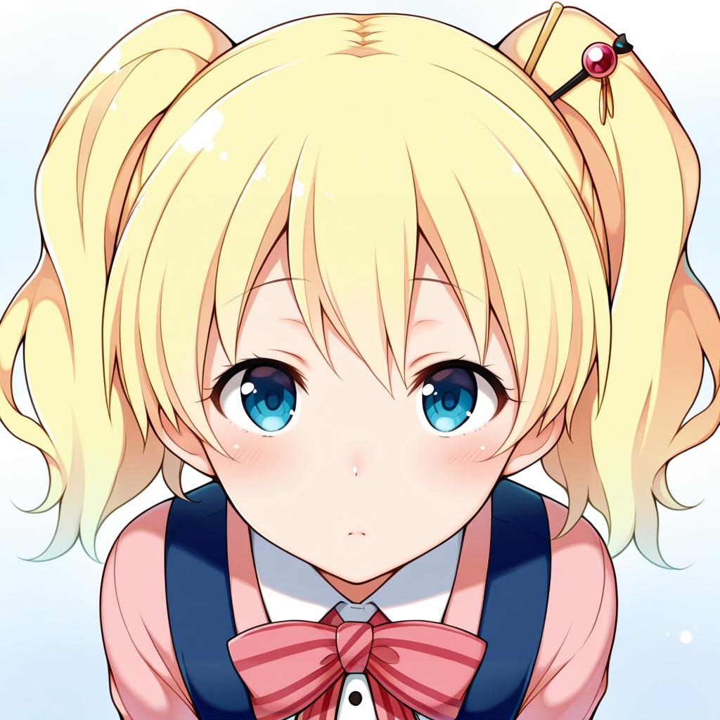 Allen avadonia, vocaloid, 1boy, blue eyes, colored eyelashes, blonde hair, short ponytail, hair ribbon, orange jacket, collared shirt, by artist yuuta (monochrome), animagine