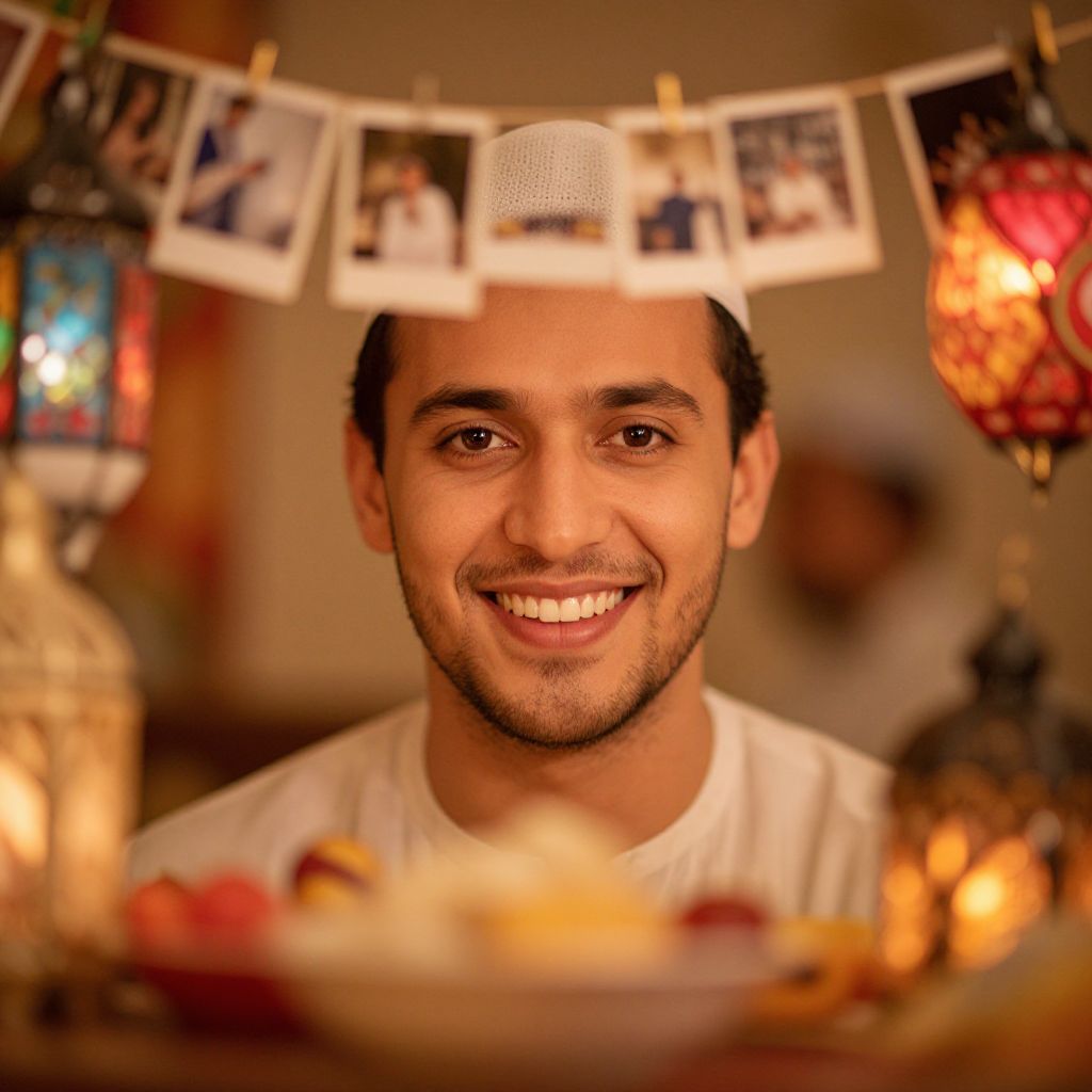 Photograph of a smiling young man with medium brown skin, short black hair, and a trimmed beard, wearing a white shirt. He is centered in the image, with a warm, softly focused background. Above his head, several small, pinned photographs hang in a semi-circle. To the left and right, blurred, ornate lampshades emit a warm, amber glow. In the foreground, a plate of colorful, out-of-focus desserts is visible. The overall ambiance is cozy and festive, with warm lighting and a homely, intimate atmosphere.