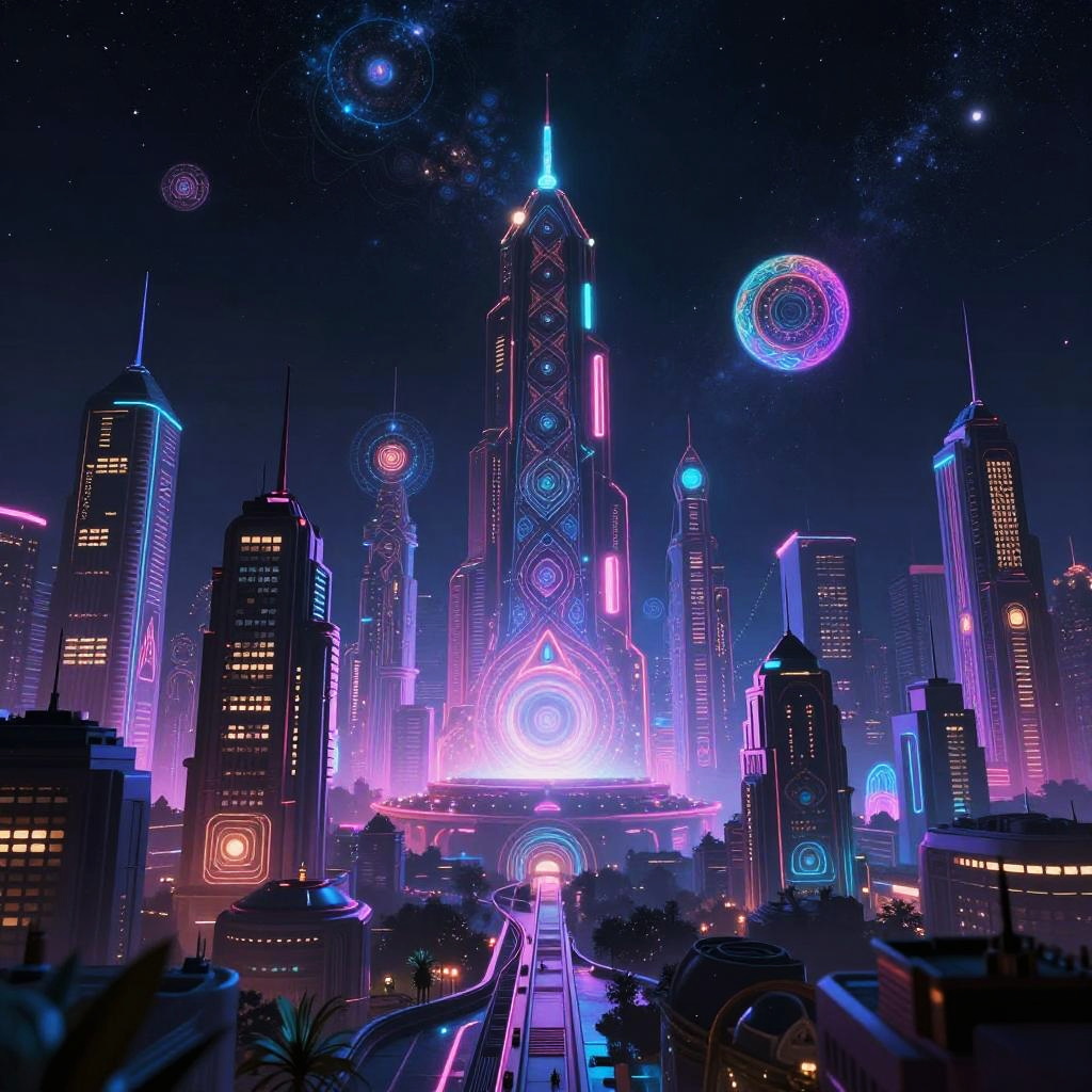 Neon-lit cityscape at dusk, featuring futuristic skyscrapers with glowing, circular patterns in vibrant purples, blues, and pinks,