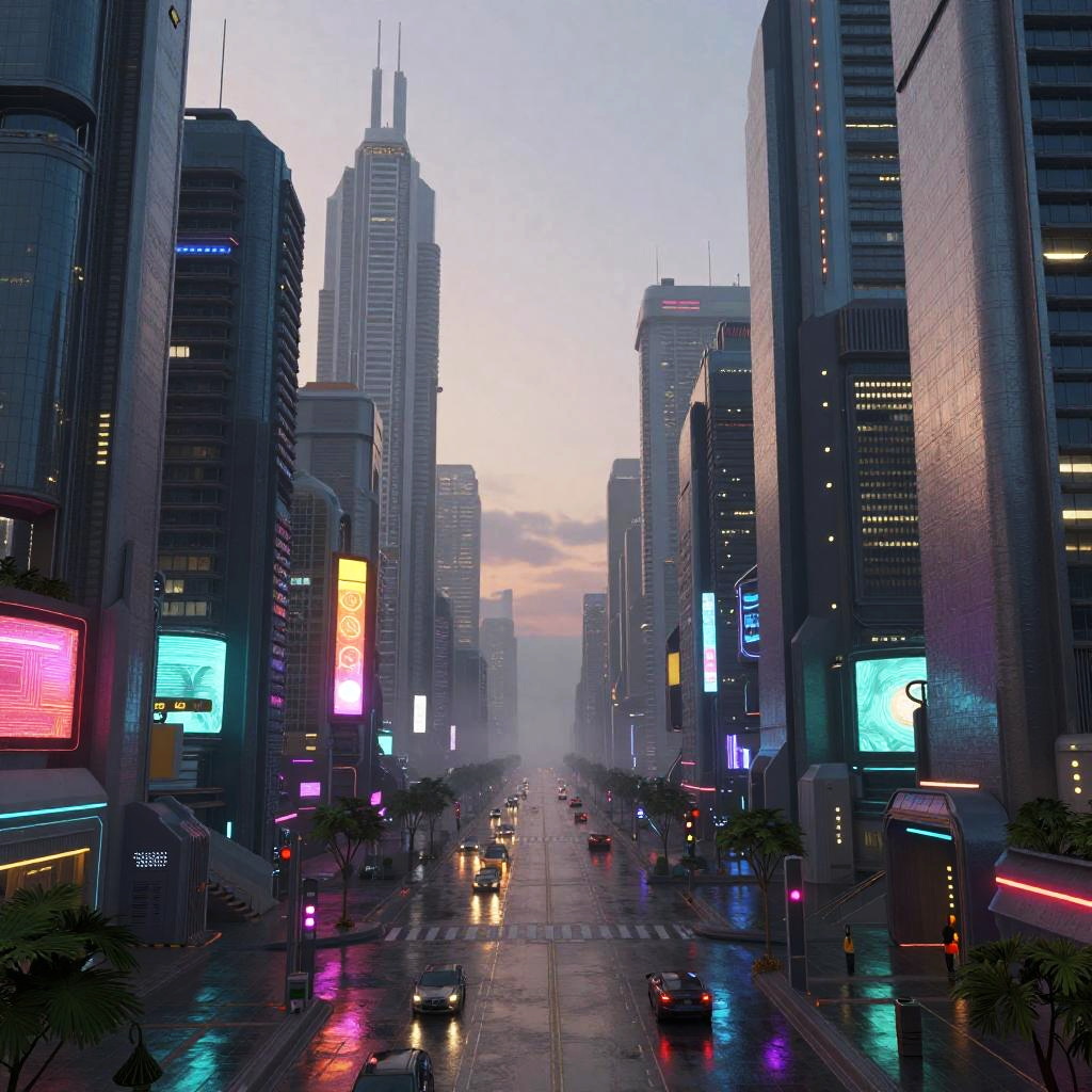 AI art generate vibrant futuristic cityscape at dusk, neon lights reflecting on wet streets, intricate geometric patterns blending with organic forms, surreal atmosphere, highly detailed digital painting, cyberpunk aesthetics, vivid colors, deep shadows