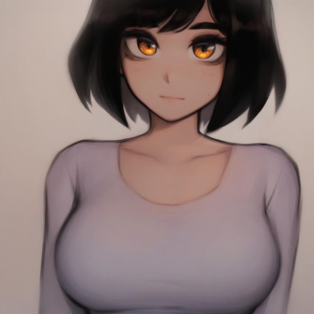 Digital artwork of an anime-style girl with medium-length black hair and brown eyes. She has a calm expression and is wearing a light purple long-sleeve shirt. The illustration features a soft, painterly style with subtle shading.