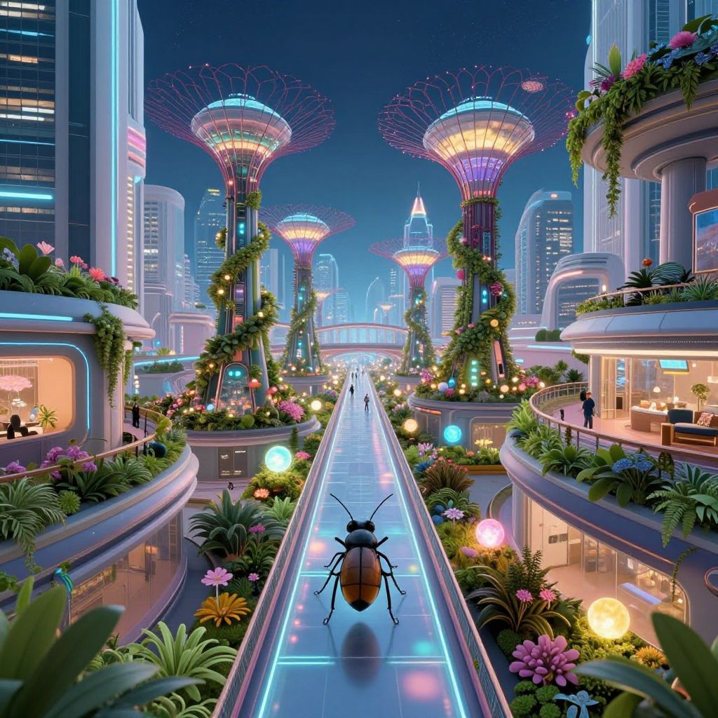 Create a surreal digital artwork showcasing a thriving futuristic metropolis from an intimate insect's viewpoint, as it navigates along a luminescent pedestrian walkway bordered by towering edifices and advanced mechanical constructs harmoniously intertwined with natural elements like spiraling plant life and blossoming flora. This vivid scene encapsulates the dynamic synergy between human ingenuity and the untamed beauty of nature, capturing an emotional spectrum that ranges from the electrifying pulse of the city's lively nightlife to the peaceful tranquility of its rooftop oases, where radiant orbs illuminate the verdant greenery beneath with a soothing, dreamlike radiance.