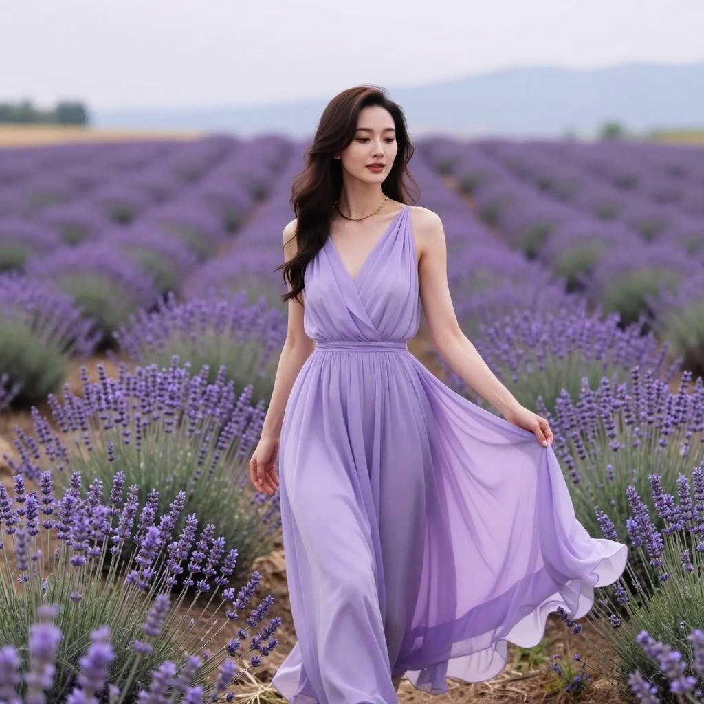 A young woman with dark braided hair and freckles walks gracefully through a blooming lavender field during golden hour. She wears a white, short-sleeved dress with buttons and a cinched waist, gently touching the purple flowers on either side of the path. The soft, warm light highlights the serene and peaceful atmosphere of the scene.