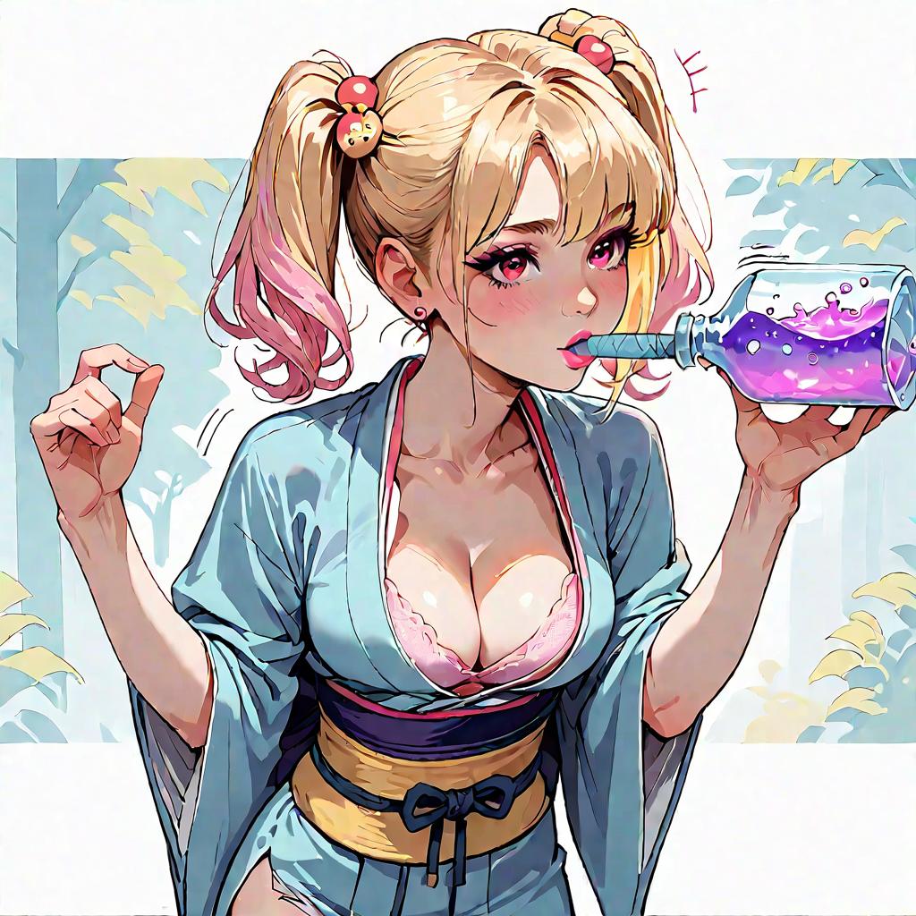 (motion lines:1.2), multiple views, flat chest/huge breasts, (cleavage:1.2), bra showing, blonde_hair, long_hair, 1girl, multicolored_hair, twintails, streaked_hair, pink_hair, hair_ornament, yellow_eyes, bangs, japanese_clothes, kimono, (ripped clothes:1.1), chugging, drinking, spilling, drinking a purple potion at school, head tilted back, score_9, score_8_up, score_7_up, anime coloring, source_anime, anime