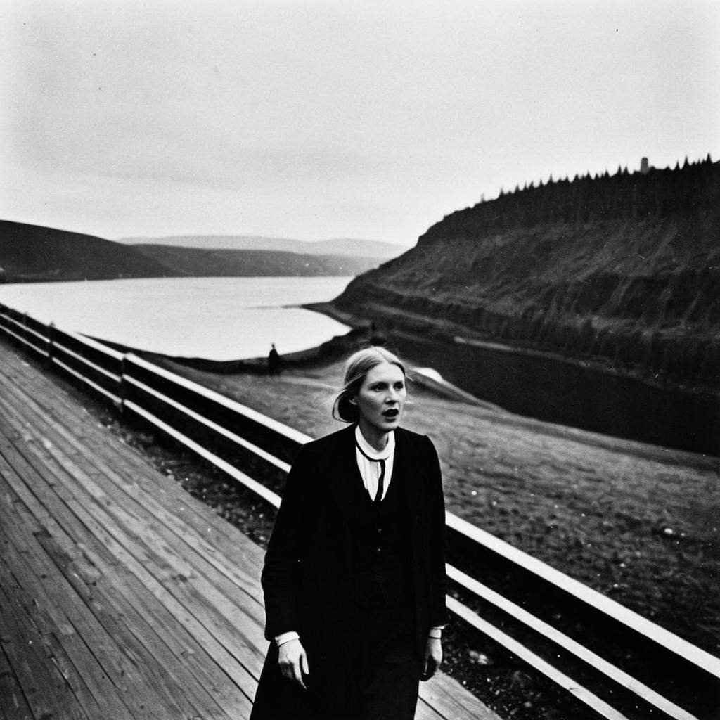 Black and white photograph of a blonde woman with long hair standing on a wooden pier by the water. She is wearing a dark buttoned coat with a belt and a white collared shirt. The background features a calm body of water, distant hills, and vintage street lamps along the pier.