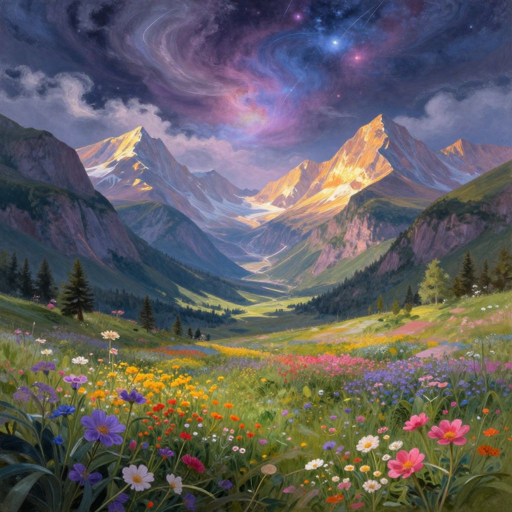 Vibrant digital painting of a mountainous valley with colorful wildflowers, towering peaks, a starry, swirling galaxy sky, and a winding river