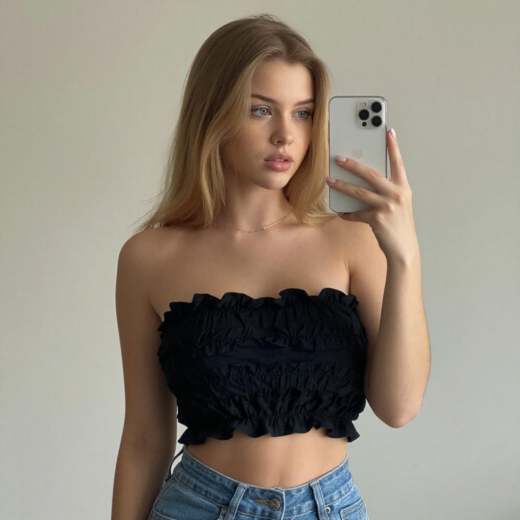 Photograph of a young woman with light brown hair, standing against a white wall in a dimly lit room. She wears a maroon lace long-sleeve top with a low neckline, revealing a hint of cleavage, and black jeans. Behind her, a chandelier hangs above a dining table with chairs, and a patterned rug covers the floor.