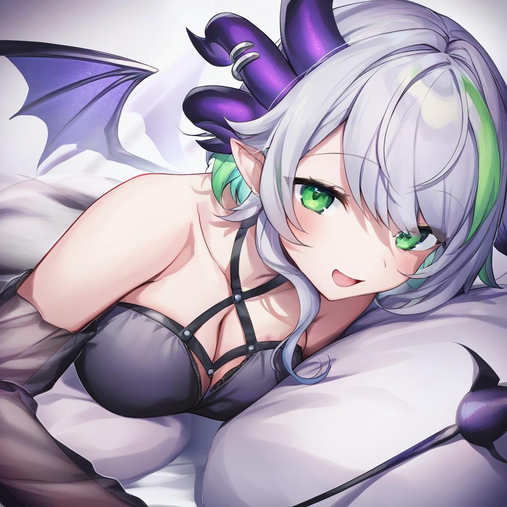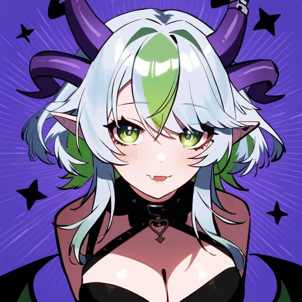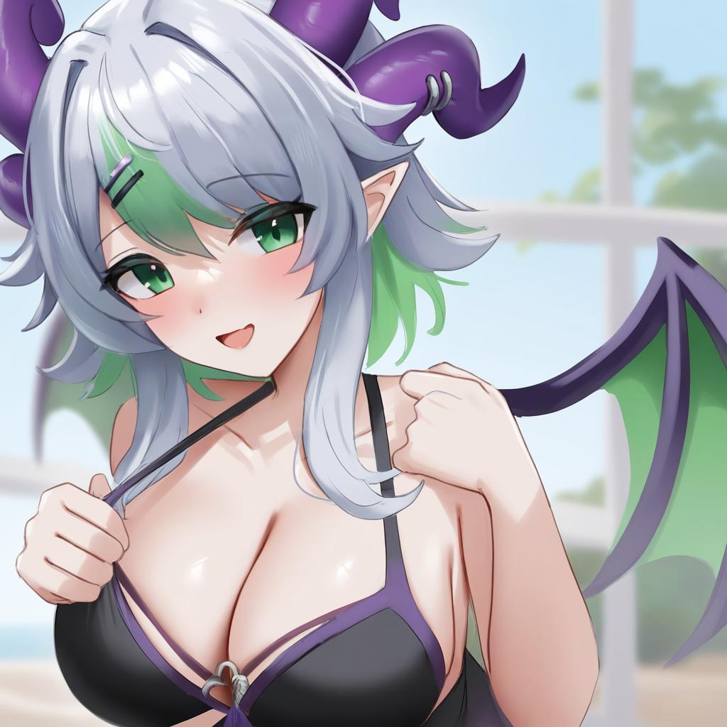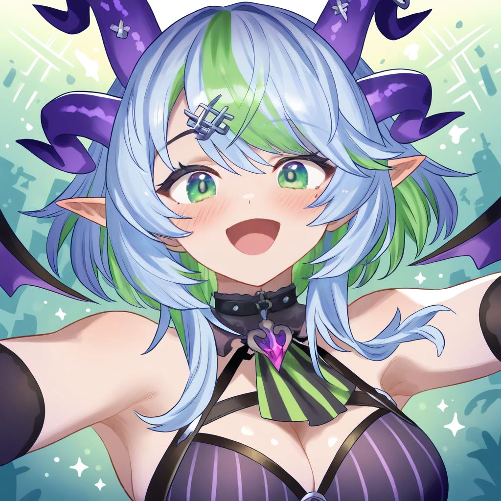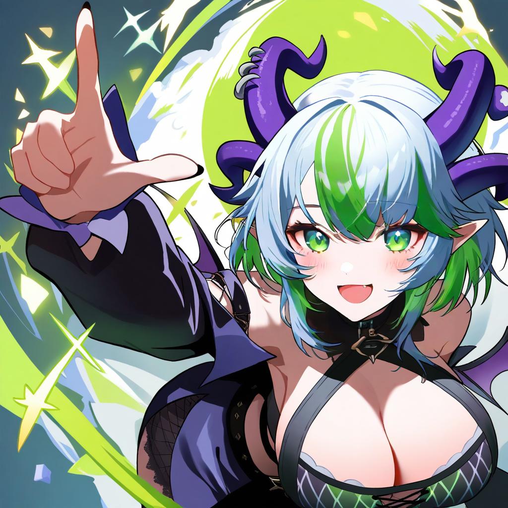 Apricot the lich, vshojo, 1girl, demon horns, demon wings, demon girl, demon wings, skin fang, multiple horns, pointy ears, green eyes, green hair, streaked hair, blue hair, short hair, grey hair, colored inner hair, medium breasts, large breasts, cleavage, virtual youtuber, virtual youtuber, by artist osiimi, leet