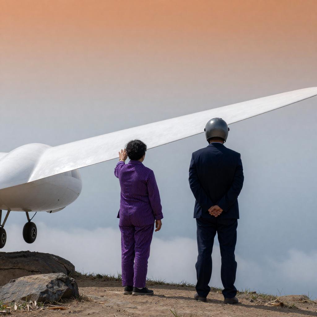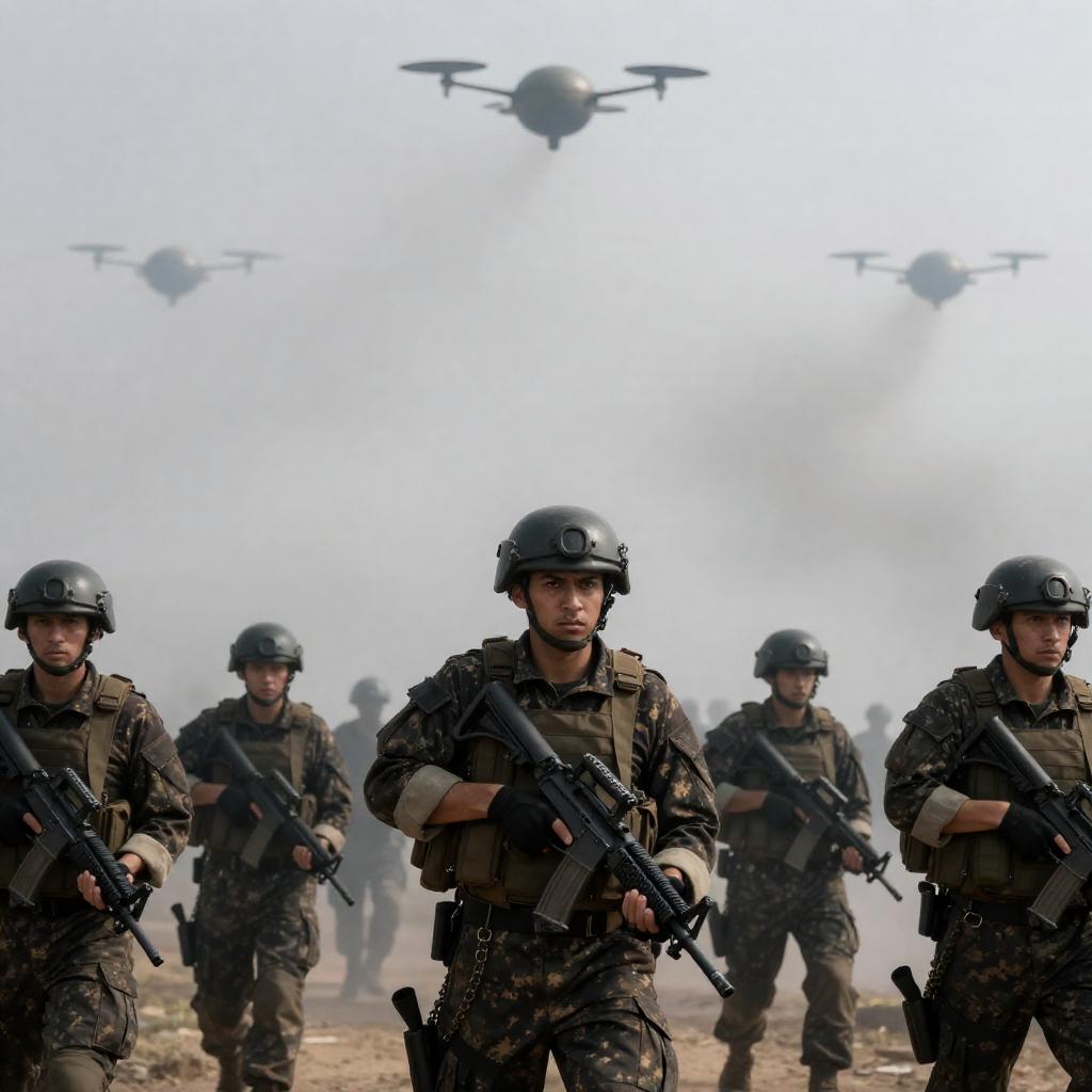 Photograph of a sleek, gray, twin-engine military drone flying above a cloud-covered, mountainous landscape. The drone has a rounded nose, twin engines under the wings, and a long, slender fuselage. The sky is clear with a gradient from blue to gray. Clouds partially obscure the ground below.