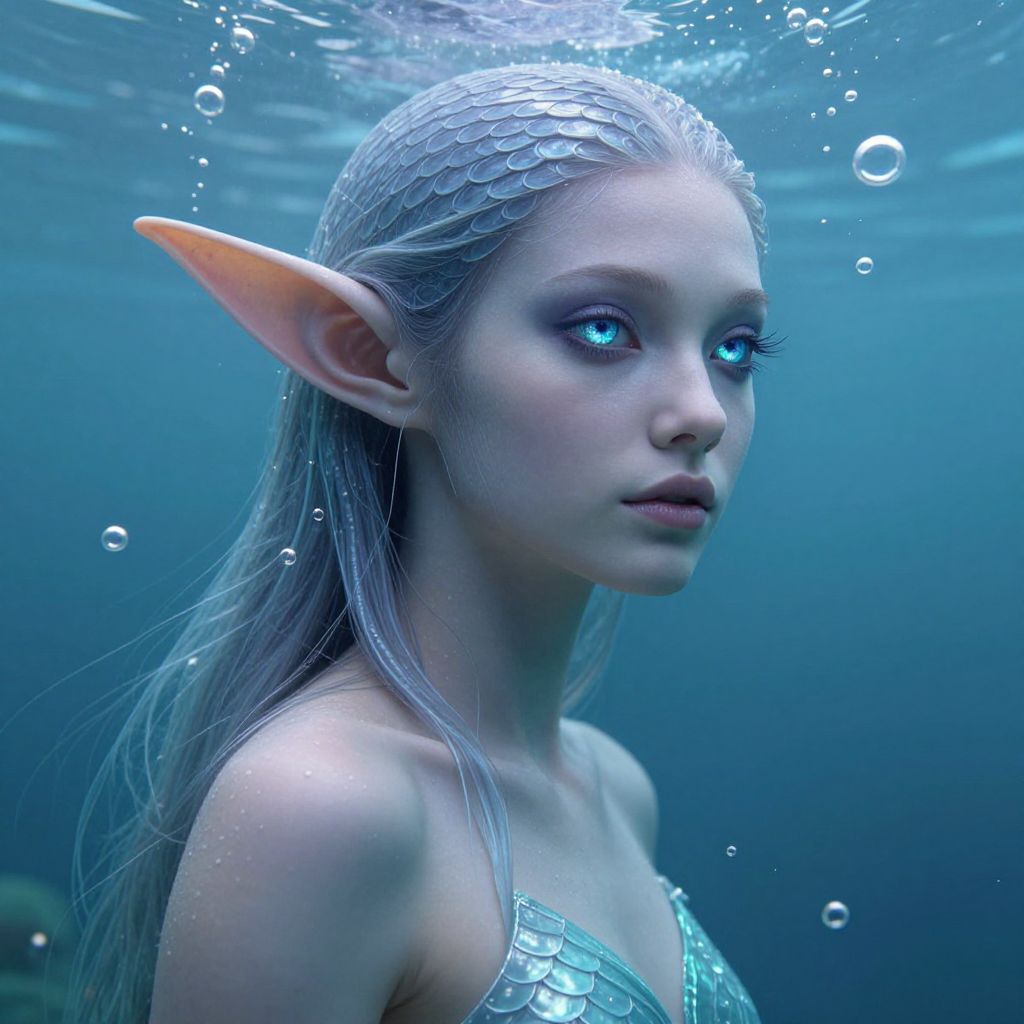 Aquatic elf portrait, serene elf with scales blending into smooth skin, long finned ears, deep ocean hues reflected in eyes, surrounded by bubbles and water currents, ethereal lighting, elegant pose, fantasy character illustration, realistic textures with a magical atmosphere