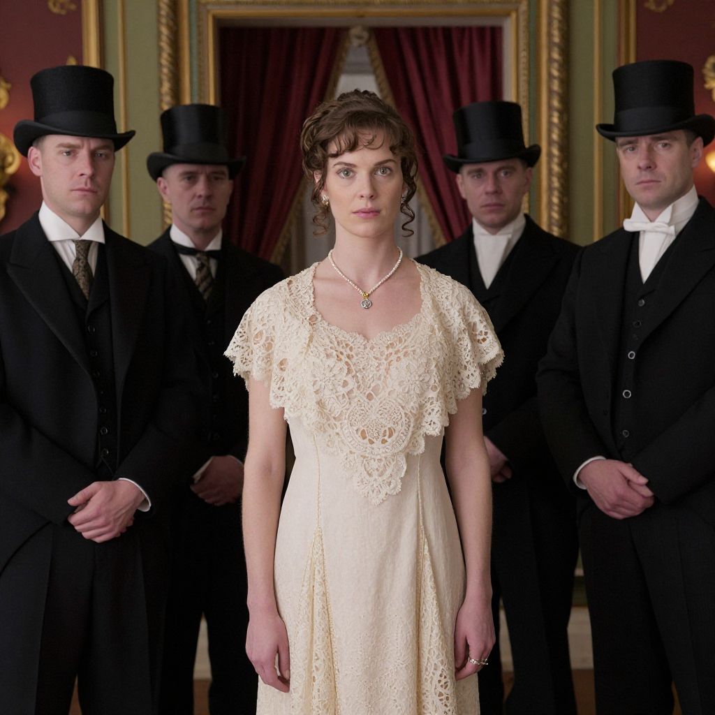 A vintage-inspired scene from *Downton Abbey*, Season 6 (1925), showcases a woman in an elegant cream lace dress designed by Anna Mary Scott Robbins, surrounded by men in formal black suits and top hats, set against a richly decorated interior with dramatic lighting and a classic, high-definition aesthetic.