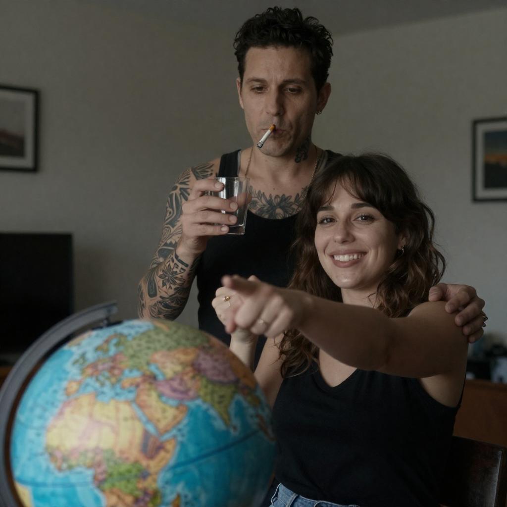 Photograph of a tattooed man with dark hair and a cigarette, standing behind a smiling woman with brown hair. He holds her hand and a glass, while she points forward. A colorful globe is in the foreground. Dimly lit room.