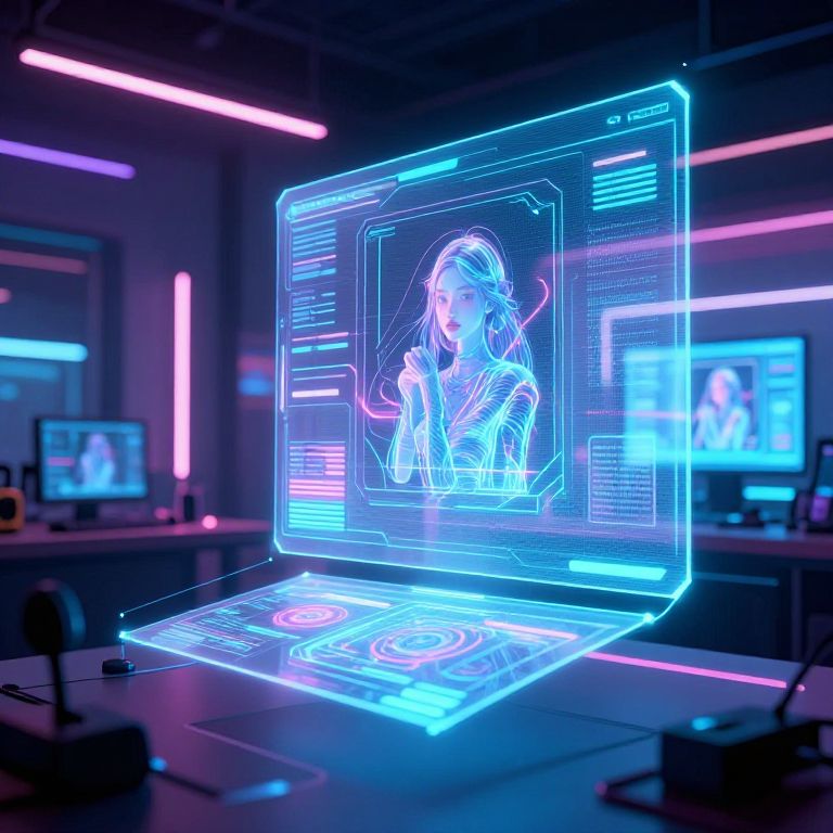 Photograph of a futuristic tech lab with neon blue and pink lighting. A glowing, neon-lit laptop in the center displays a holographic image of a young woman with long hair, wearing a futuristic outfit, interacting with the screen. Surrounding laptops also emit blue neon light, creating a cyberpunk atmosphere. The background includes blurred desks and monitors, enhancing the high-tech, sci-fi vibe. The neon lights and holographic display create a vivid, otherworldly effect. The overall scene is sleek, modern, and highly stylized.