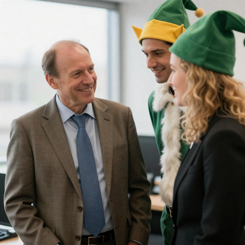 Photograph of three people in an office setting. A middle-aged man with receding hair, wearing a brown checkered suit and blue tie, smiles at a woman with curly blonde hair in a black suit. A man in a green and yellow elf hat with white fur collar leans in, smiling. Bright window light in the background.