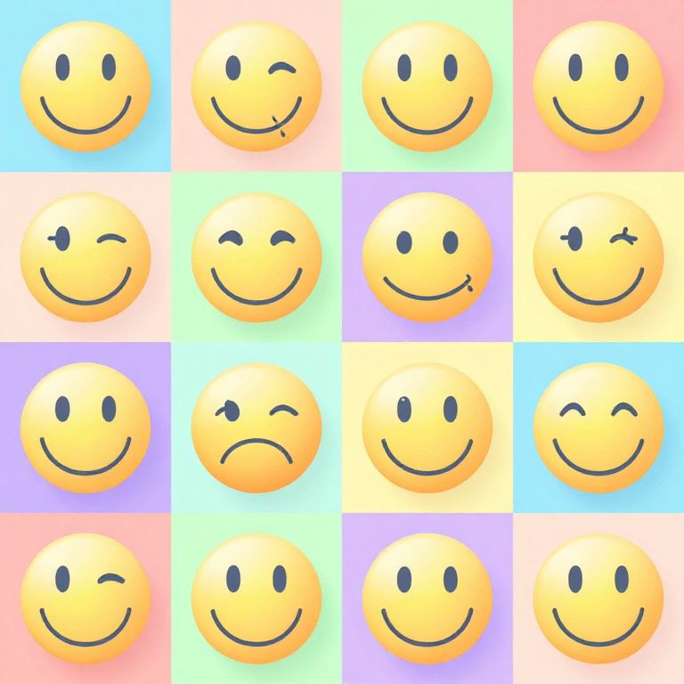 Pictures of smiley faces, each with different emotions and expressions, arranged in a colorful collage, bright pastel colors with a slight texture overlay, cheerful and uplifting mood, modern flat design with subtle gradients