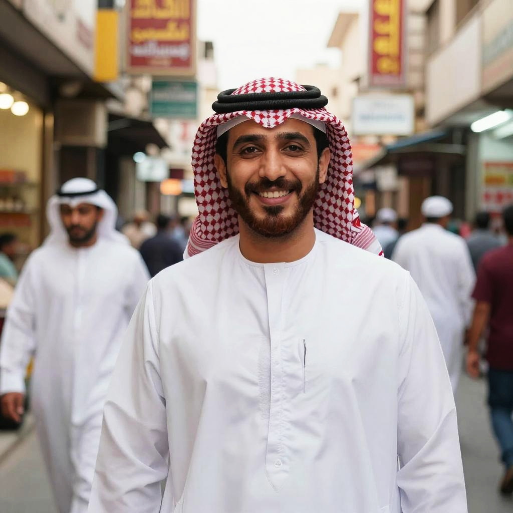 Photograph of a smiling Middle Eastern man with a dark complexion, short black beard, and brown eyes. He wears a traditional white thawb and a white ghutra with a black agal. Behind him is a large, beige, dome-topped mosque with arched windows, reflected in a calm, turquoise pool. The sky is clear and blue. The man stands centrally, occupying the foreground, while the mosque occupies the background. The image has a bright, daytime setting, with sharp contrasts and vivid colors.