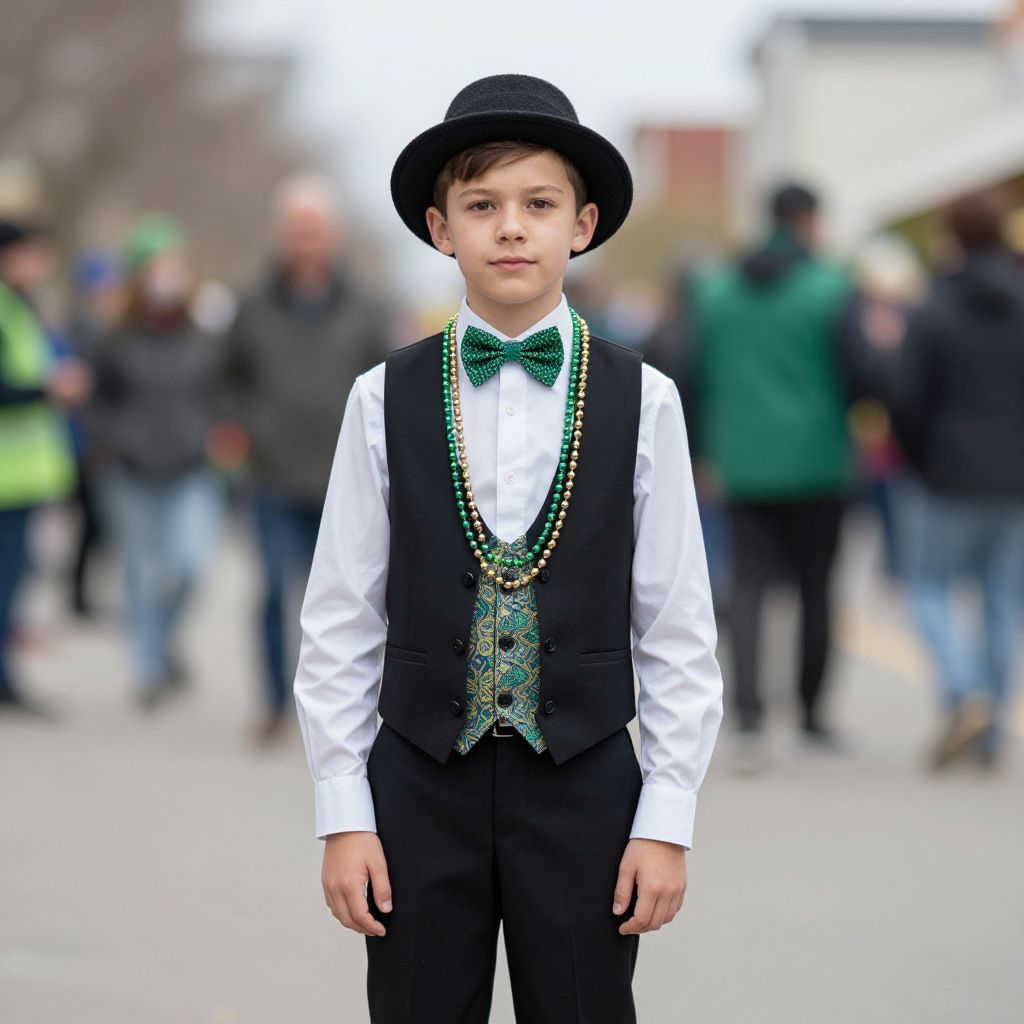 Male mardi gras outfit, 1boy, male focus, solo, outdoors, bowtie, looking at viewer, bow, pants, vest, blurry background, hat, blurry