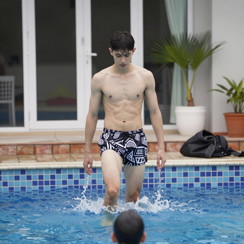 Shirtless young man with short dark hair, wearing black and white patterned swim trunks, stands in a blue-tiled swimming pool. Water splashes around his legs. Another person's head is visible in the pool at the bottom. Background: white-framed glass doors, potted plants, brick steps. Coat and bag on ground to the right.