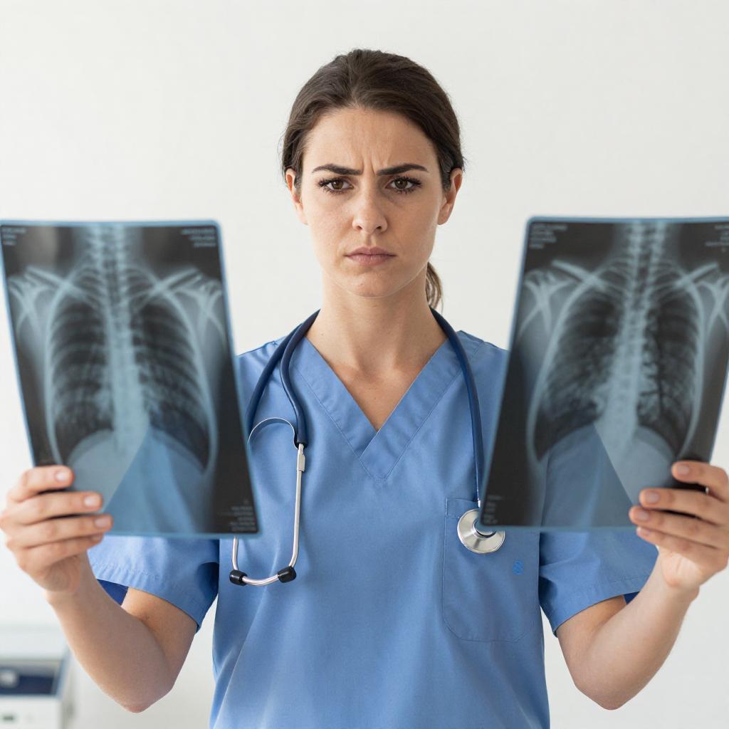 Photograph of a serious-looking female nurse with light skin and dark hair, wearing light blue scrubs and a stethoscope around her neck. She's holding two black X-ray images, one in each hand, showing white bone structures. The camera angle is straight-on, with even lighting and a shallow depth of field, making the background completely white and blurred.
