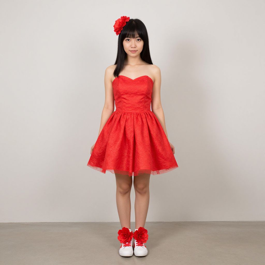 Home made woman costume, solo, 1girl, sneakers, shoes, flower, standing, hair flower, realistic, looking at viewer, full body, asian, dress, red footwear, black hair, hair ornament