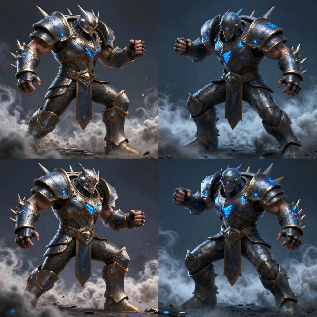 This image is a digital CGI artwork featuring a dramatic, fantasy-style battle scene. It's divided into a 2x2 grid, showing four dynamic poses of two heavily armored, muscular warriors in a cloud-filled, dark, blue-tinted environment. The warriors have glowing blue accents, and their armor is detailed with spikes and metallic textures. They're engaged in intense combat, with one warrior appearing to overpower the other in each frame.