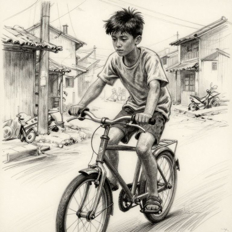 Neo-Traditional charcoal drawing, 15-year-old boy ride on the bicycles, small town street, black short messy hair, thick texture, visible strokes,