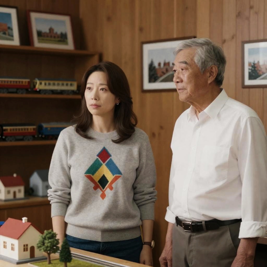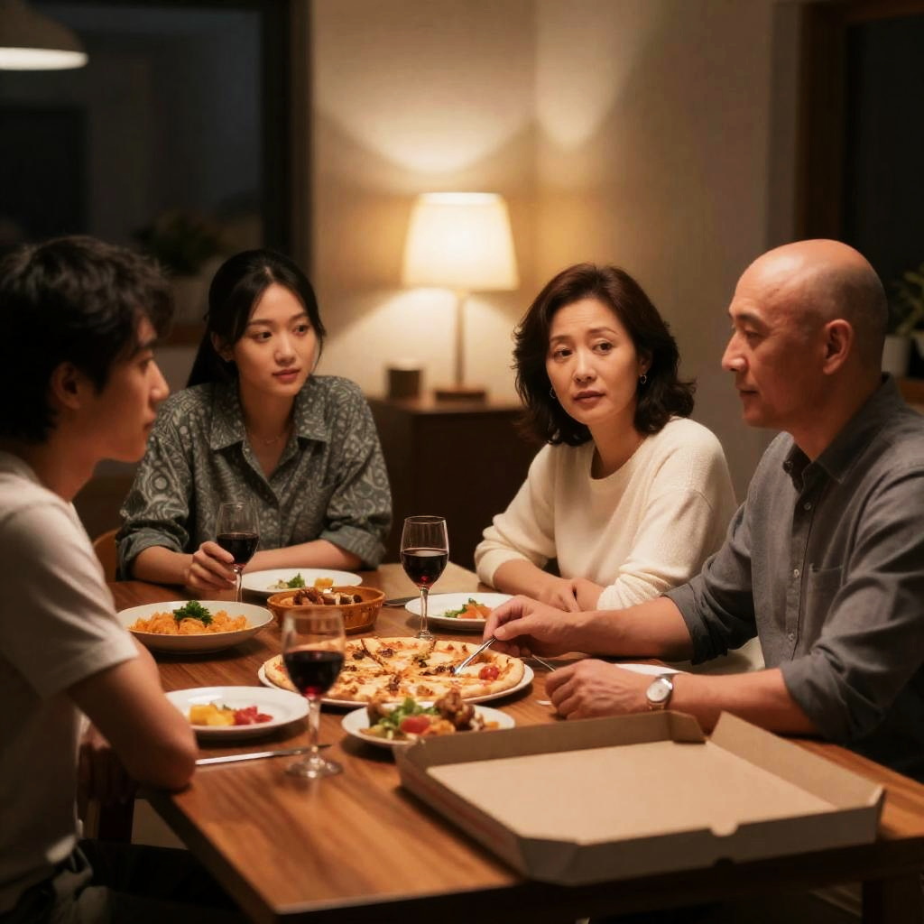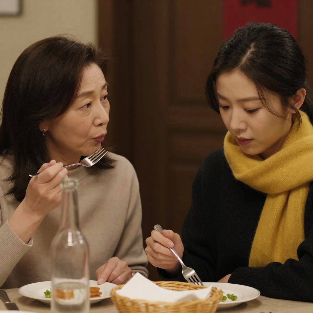 Photograph of two women at a table. Older woman with dark hair, beige sweater, eating with fork, looking at younger woman. Younger woman with dark hair, black sweater, yellow scarf, holding fork, looking down at plate. Glass bottle and basket with napkins on table. Warm indoor lighting. Background has blurred brown and red elements. Both women have focused expressions.