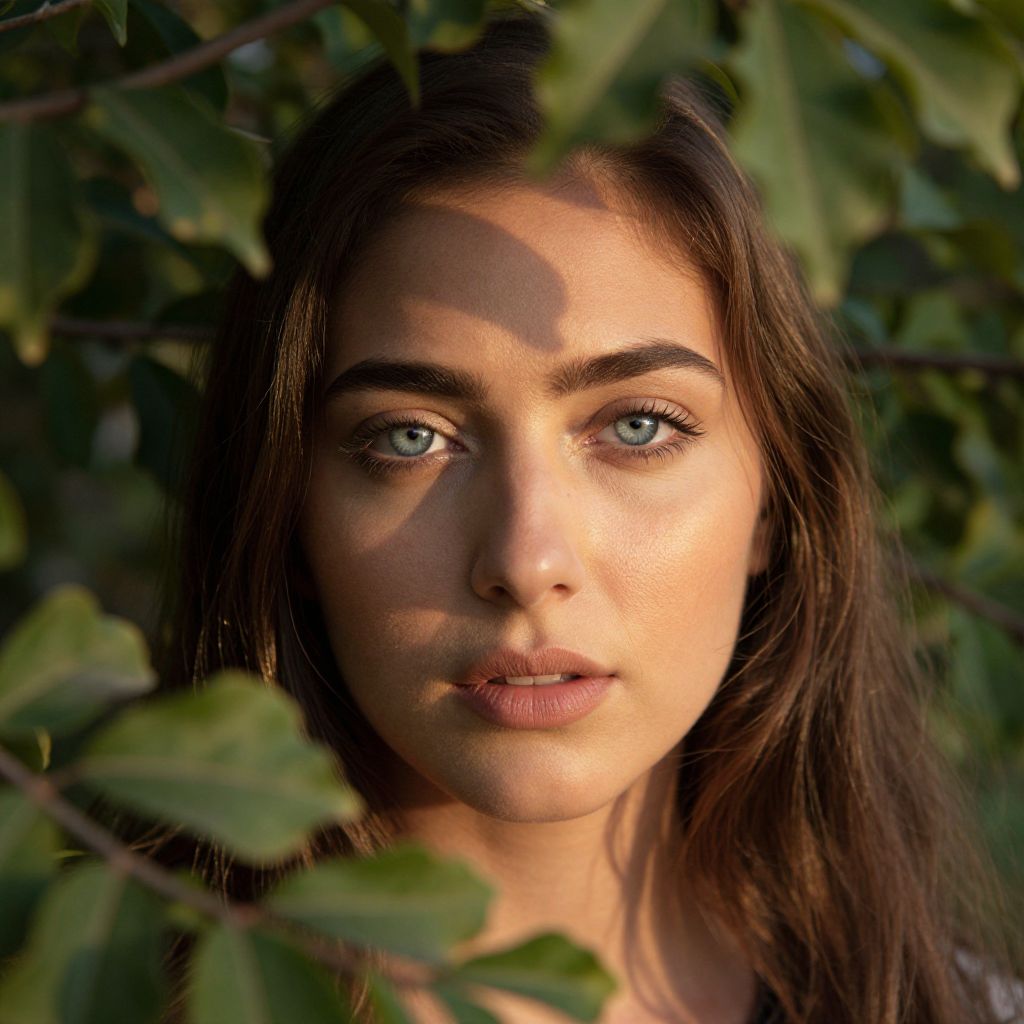 A photorealistic portrait photograph captures an enigmatic Middle Eastern woman with striking silver-blue eyes and delicate skin kissed by the sun's golden rays. The warm glow of an early morning sun filters through a dense canopy of leaves, casting a subtle pattern of light and shadow across her face. From a high-angle perspective above, the intricate details of her facial features are emphasized, highlighting wisps of hair gently brushing against her cheeks amidst lush foliage. This harmonious blend of nature's beauty and human emotion evokes an ultrarealistic depiction.