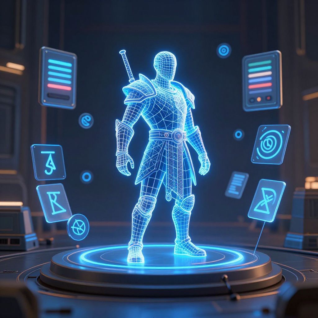 3d sprite maker character creation scene with a fantasy warrior sprite emerging from a glowing blue wireframe model, surrounded by magical runes and translucent sliders, sci-fi studio setting, cinematic mood lighting and intricate polygon details