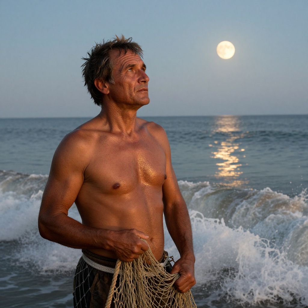 A highly realistic portrait depicts a sun-tanned fisherman, his face weathered by life's trials, standing against crashing waves bathed in golden hour light. Captured from an unusual low angle, he gazes up at the shimmering full moon reflected in the tranquil waters behind him, exuding solitude and contemplation. His rough hands firmly grasp a well-worn net as salt-tinged hair falls across his furrowed brow, blending naturalism with artistic flair reminiscent of 19th-century maritime paintings to create an emotionally charged portrait that encapsulates life's challenges and victories.