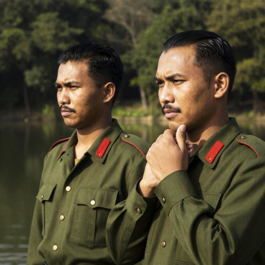 Three shirtless Asian men wearing striped pants and matching caps standing on a wooden staircase in an industrial setting. One man on the left holds a wicker basket, the man in the center is slightly turned away, and the man on the right is holding a rope. The scene is illuminated with warm yellow lighting, emphasizing the texture of the staircase and the men's relaxed postures.