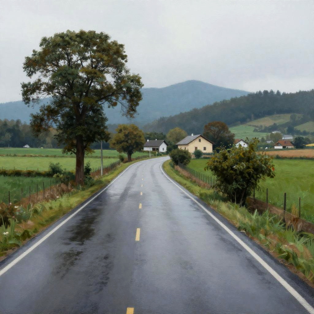 Painting of a rural road. Wet, dark asphalt road curves through green fields. Single tall tree on left, two small houses in background. Overcast sky, mountains in distance. Bushes on right, fence along road. No people.