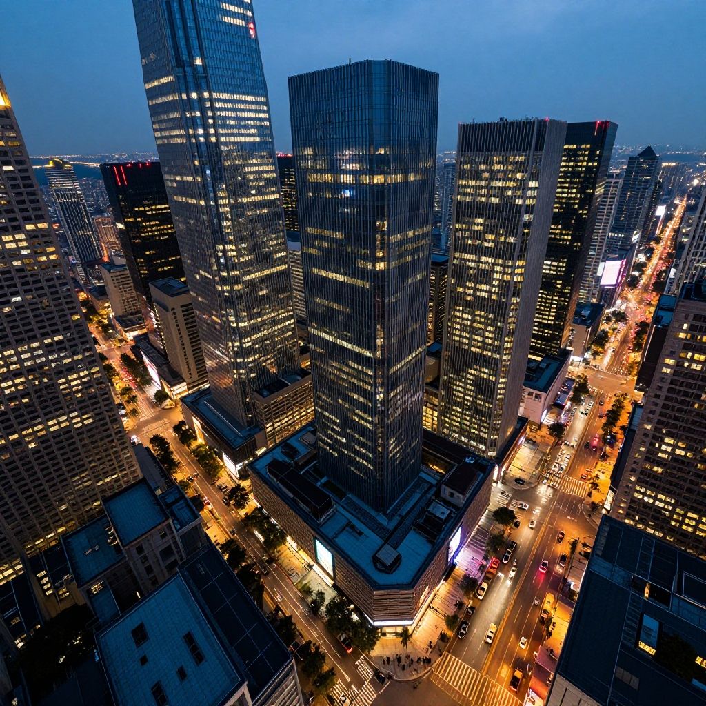 Top down view of city at dusk, skyscrapers glowing with lights, busy streets filled with cars, detailed rooftops, vibrant urban life, futuristic cyberpunk aesthetic, high resolution