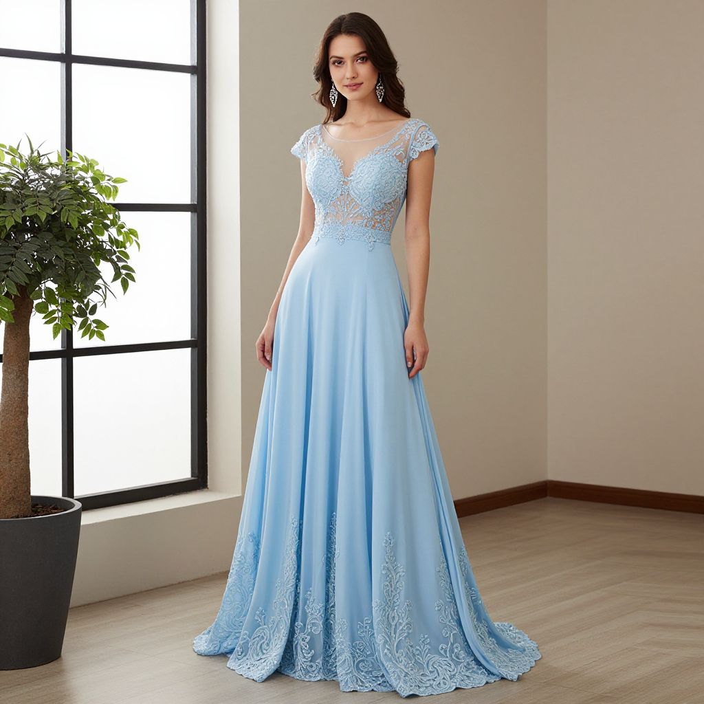 Elegant woman standing gracefully in a handmade, long prom dress featuring a light blue, flowing gown with intricate lace detailing and a sheer, embellished bodice, complemented by dangling earrings and positioned near a large window with a potted plant to the left.