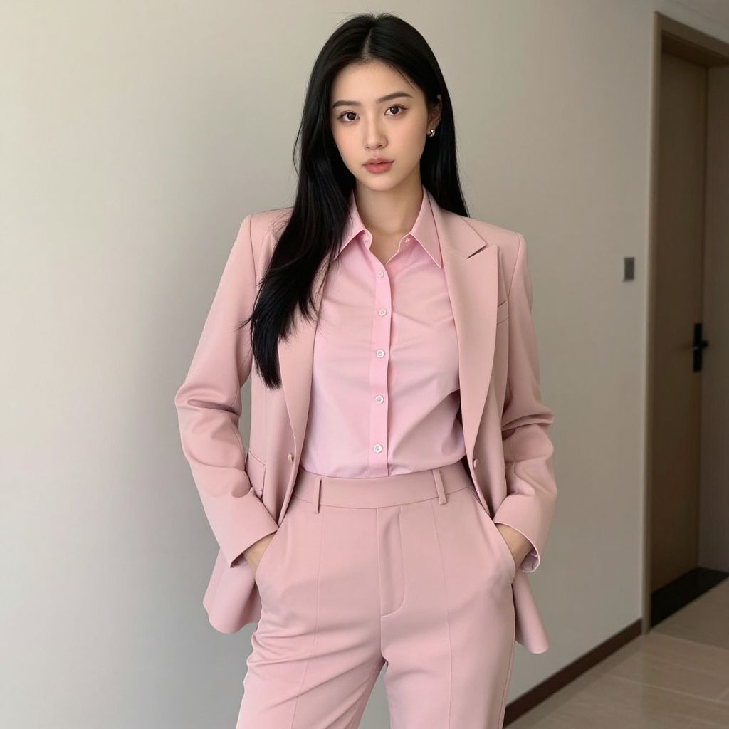 Pink pant suit costume, solo, 1girl, jacket, black hair, hands in pockets, long hair, pants, pink shirt, looking at viewer, realistic, indoors, shirt