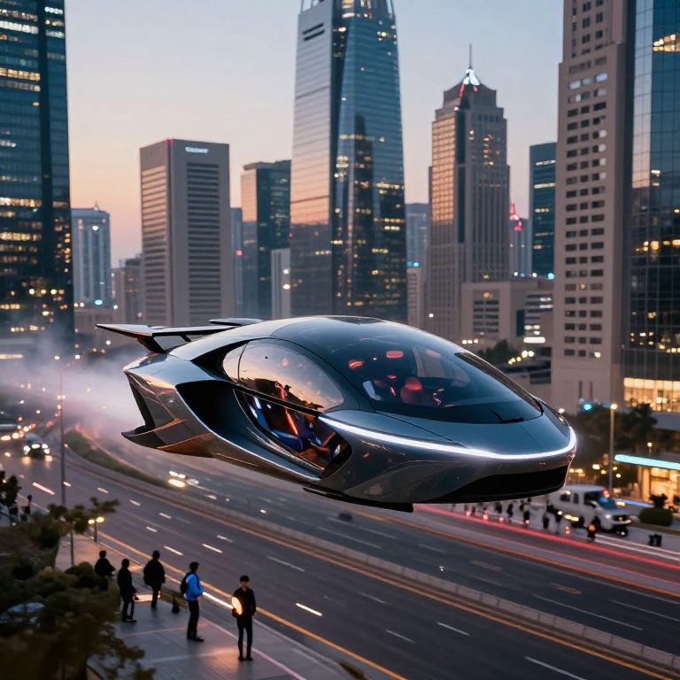 Photograph of a sleek, black, futuristic flying car with a glossy surface and illuminated red lights hovering above a busy urban street during twilight. The cityscape in the background features tall, modern skyscrapers with lit windows, reflecting the fading blue and orange hues of the sky. Below, a multi-lane road with moving vehicles and several pedestrians is visible. The flying car's aerodynamic design and smooth curves contrast with the linear, grid-like urban environment. The overall atmosphere combines advanced technology with a bustling city life.